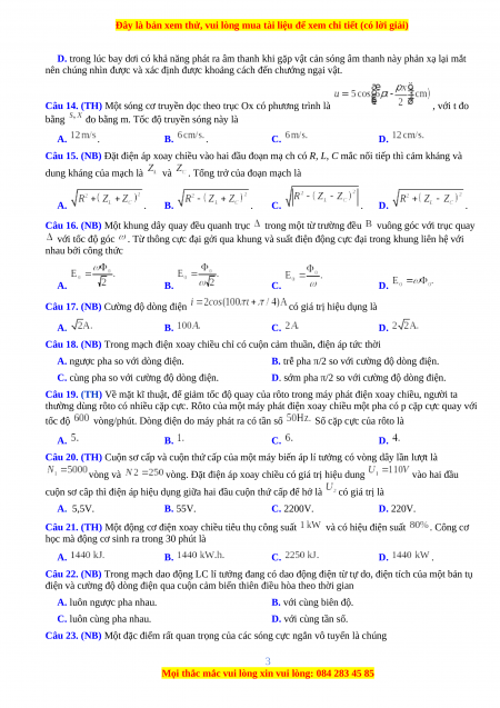 Câu 20. (TH) Cuộn sơ cấp và cuộn thứ cấp của một máy biến áp lí tưởng có vòng dây lần lượt là vòng và