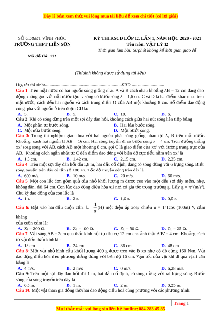 Đây là bản xem th , vu ử i lòng mua tài li u ệ đ xe ể m chi ti t ế (có l i ờ gi i ả ) S G Ở D&ĐT VĨNH PHÚC KỲ THI KSCĐ L P Ớ 12, L N Ầ 1, NĂM H C Ọ 2020 - 2021 TRƯ N Ờ G THPT LI N Ễ S N Ơ Tên môn: V T Ậ LÝ 12 Th i