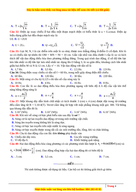 Đây là bản xem th , vu ử i lòng mua tài li u ệ đ xe ể m chi ti t ế (có l i ờ gi i ả ) m 1 m k 1 k A. T 2 B. T C. T 2 D. T k 2 k m 2 m Câu 32: Đi n ệ áp xoay chi u ề ở hai đ u ầ m t ộ đo n ạ m c ạ h đi n ệ có bi u ể th c ứ là u = U0cosωt. Đi n ệ áp hi u ệ d ng ụ gi a