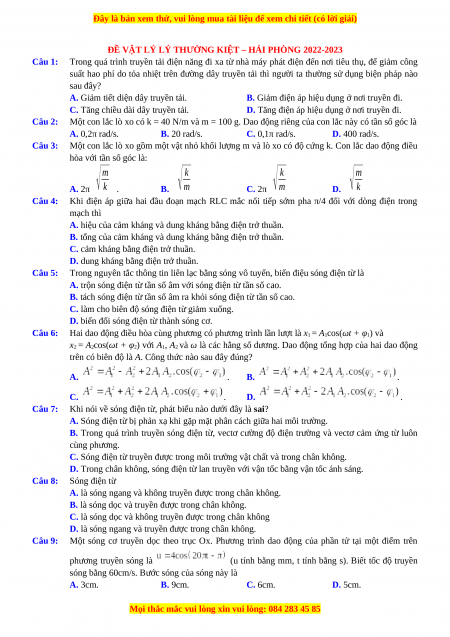 ĐỀ VẬT LÝ LÝ THƯỜNG KIỆT – HẢI PHÒNG 2022-2023 Câu 1: