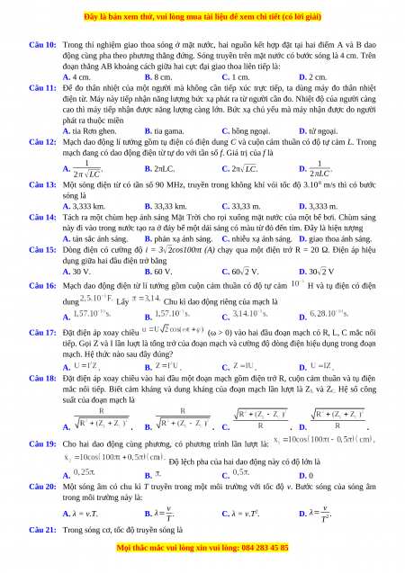Câu 10: Trong thí nghiệm giao thoa sóng ở mặt nước, hai nguồn kết hợp đặt tại hai điểm A và B dao