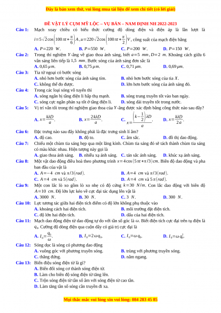 ĐỀ VẬT LÝ CỤM MỸ LỘC – VỤ BẢN – NAM ĐỊNH NH 2022-2023 Câu 1: