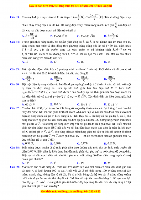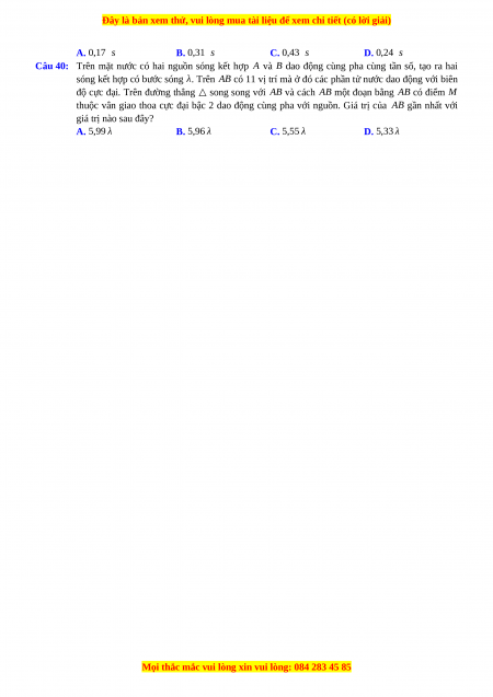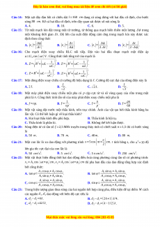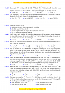 Câu 20: Sóng điện từ có tần số f =2,5 MHz truyền trong thủy tinh có chiết suất n=1,5 thì có bước sóng là A. 50 m. B. 70 m. C. 40 m. D. 80 m. π