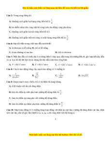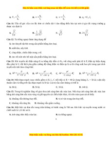Câu 1: Máy phát đi n ệ xoay chi u ề m t ộ pha có p c p ặ c c ự , rô to quay v i ớ t c ố đ ộ n vòng/s. Công th c ứ tính t n ầ s f c ố a ủ dòng đi n xoa ệ y chi u do m ề áy phát ra là n p A. f . n p. B. f . n . p C. f . D. f . p n Câu 2: Cư ng đ ờ ộ âm tại m t ộ đi m ể là I, cư ng ờ đ â ộ m chu n l ẩ à Io, thì m c ứ cư ng ờ đ â ộ m t i ạ đi m ể đó là I I I I A. 10lg dB . B. 0 10lg dB . C. 10lg B . D. dB . I I I 0 I 0 0 Câu 3: M t ộ vật dao đ ng đi ộ ều hòa v i ớ chu kì T thì th nă ế ng c a ủ vật bi n t ế hiên T A. tuần hoàn v i ớ chu kì là 2T. B. tuần hoàn v i ớ chu kì là . 2 T C. điều hòa v i ớ chu kì . D. điều hòa v i ớ chu kì T. 4
