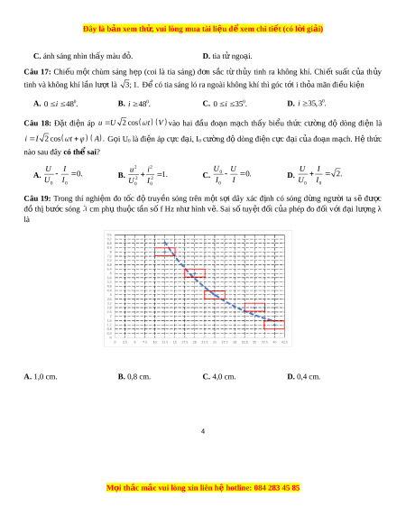 ợ là 3; 1. Để có tia sáng ló ra ngoài không khí thì góc t i ớ i th a ỏ mãn đi u ề ki n ệ A. 0 0 i 4 8 . B. 0 i 4 8 . C. 0 0 i 3 5 . D. 0 i 3 5, 3 . Câu 18: Đặt đi n ệ áp u U