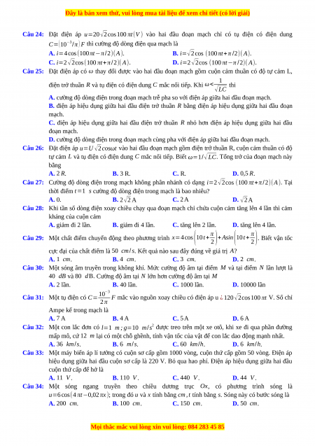 Câu 21: Với cùng một công suất cần truyền tải, nếu tăng hiệu điện thế hiệu dụng ở nơi truyền đi lên 20