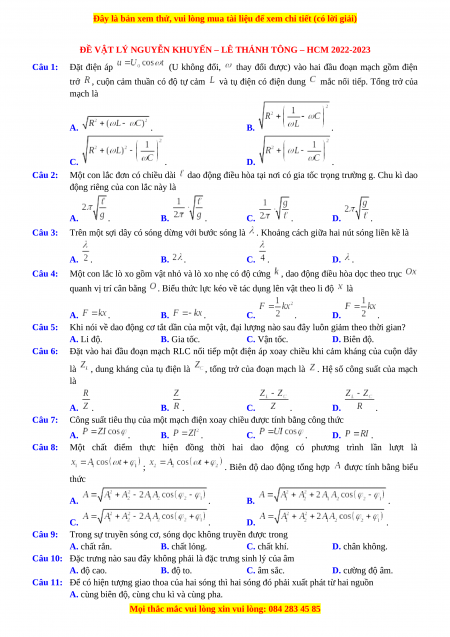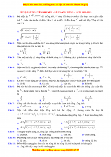 ĐỀ VẬT LÝ NGUYỄN KHUYẾN – LÊ THÁNH TÔNG – HCM 2022-2023 Câu 1: Đặt điện áp