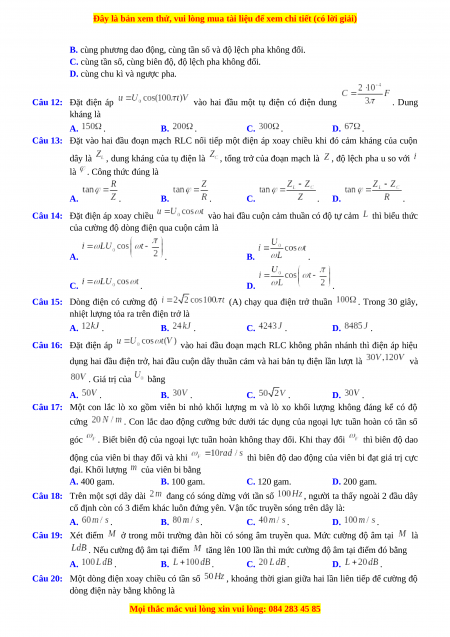 . Biên độ dao động tổng hợp được tính bằng biểu thức A. . B. . C. . D. . Câu 9: