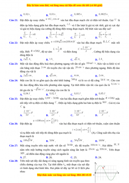 Câu 20: Một dòng điện xoay chiều có tần số , khoảng thời gian giữa hai lần liên tiếp để cường độ