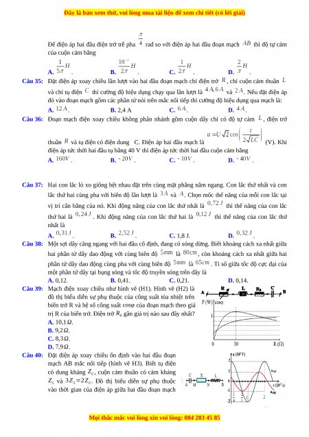 Câu 36: Đoạn mạch điện xoay chiều không phân nhánh gồm cuộn dây chỉ có độ tự cảm , điện trở