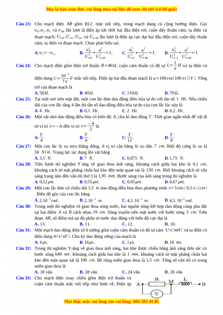 Câu 23: Cho mạch điện AB gồm RLC mắc nối tiếp, trong mạch đang có cộng hưởng điện. Gọi u ,u , u R L