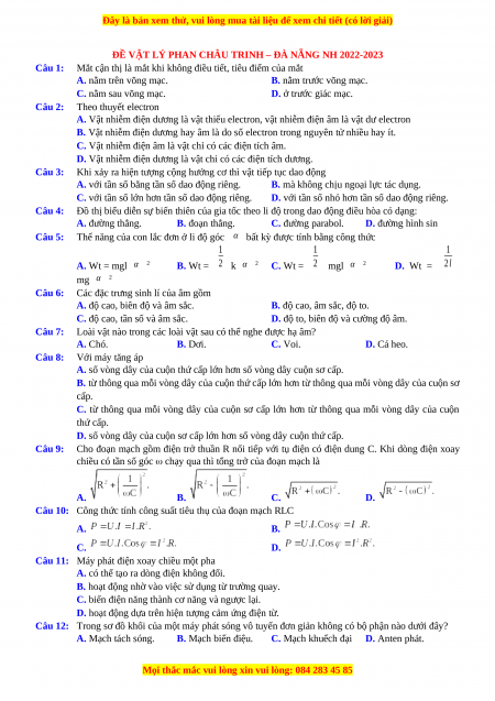 ĐỀ VẬT LÝ PHAN CHÂU TRINH – ĐÀ NẴNG NH 2022-2023 Câu 1:
