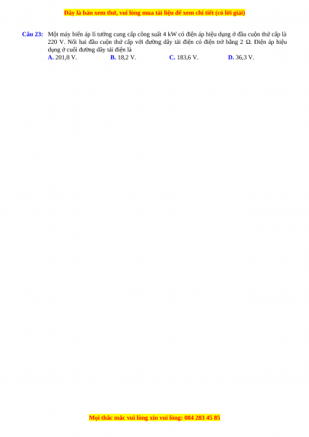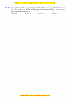Câu 23: Một máy biến áp lí tưởng cung cấp công suất 4 kW có điện áp hiệu dụng ở đầu cuộn thứ cấp là
