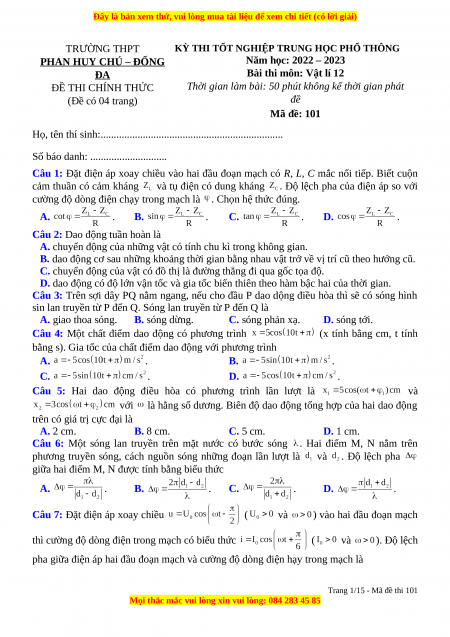Bài thi môn: Vật lí 12 ĐỀ THI CHÍNH THỨC