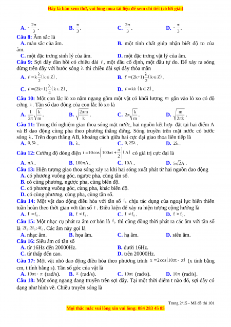 Câu 15: Một nhạc cụ phát ra âm cơ bản là thì cũng đồng thời phát ra các âm với tần số là . Các âm này gọi là A. nhạc âm. B. họa âm. C. hạ âm. D. siêu âm.