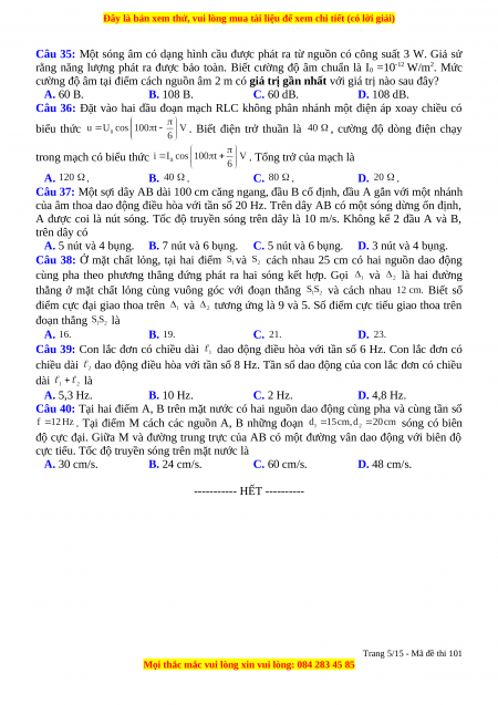 Câu 35: Một sóng âm có dạng hình cầu được phát ra từ nguồn có công suất 3 W. Giả sử