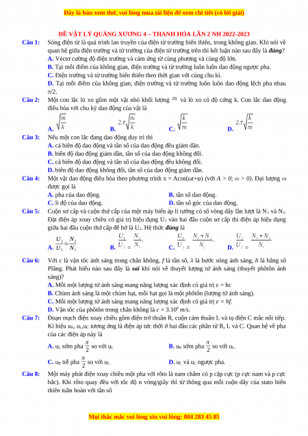 ĐỀ VẬT LÝ QUẢNG XƯƠNG 4 – THANH HÓA LẦN 2 NH 2022-2023 Câu 1: