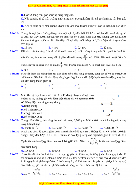 Câu 20: Khi cho một tia sáng đơn sắc đi từ nước vào một môi trường trong suốt X, người ta đo được