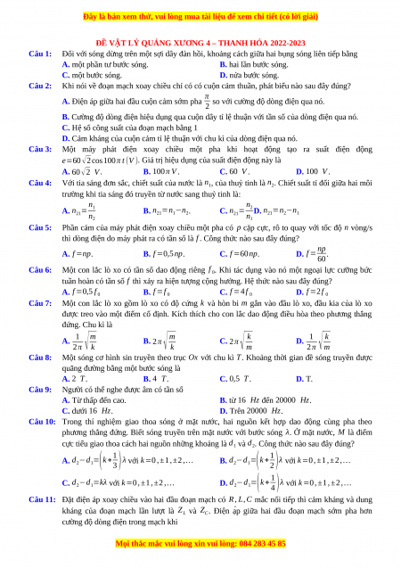 ĐỀ VẬT LÝ QUẢNG XƯƠNG 4 – THANH HÓA 2022-2023 Câu 1: