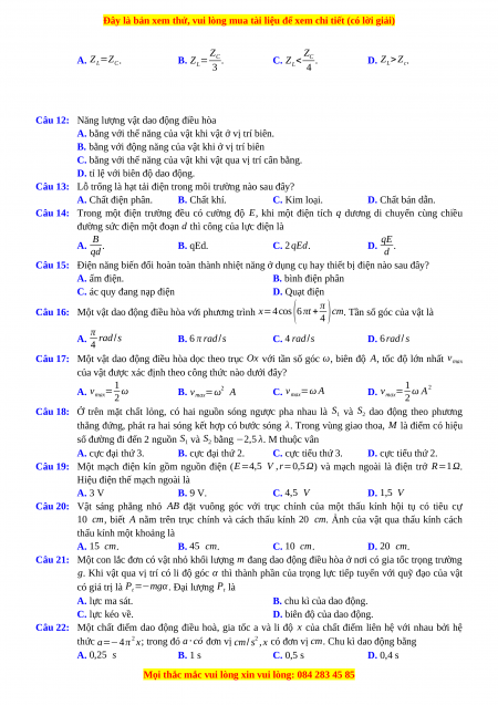 Câu 11: Đặt điện áp xoay chiều vào hai đầu đoạn mạch có R , L, C mắc nối tiếp thì cảm kháng và dung