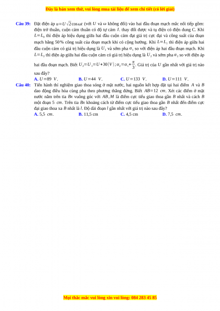 Câu 40: Tiến hành thí nghiệm giao thoa sóng ở mặt nước, hai nguồn kết hợp đặt tại hai điểm