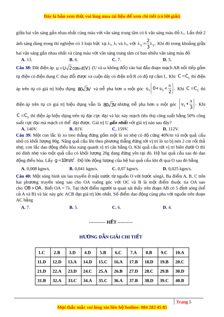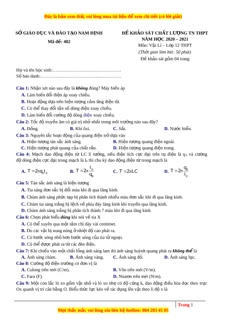 Đây là bản xem th , vu ử i lòng mua tài li u ệ đ xe ể m chi ti t ế (có l i ờ gi i ả ) SỞ GIÁO D C Ụ VA ĐAO T O Ạ NAM Đ N Ị H Đ K Ề H O Ả SÁT CH T Â LƯƠNG TN THPT O Mã đ : 402 ề NĂM H C 2020 – 2021 Môn: Vật Lí – L p ơ 12 THPT (Th i