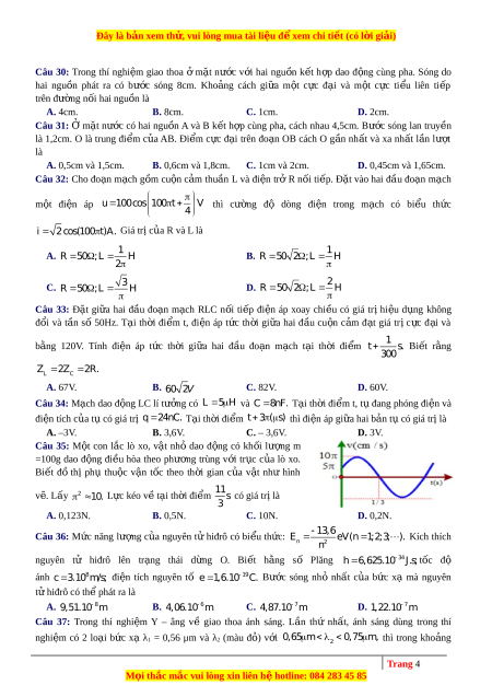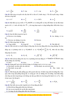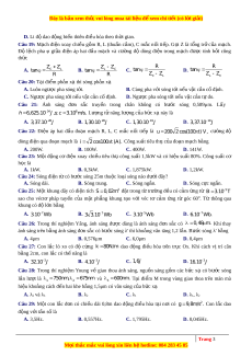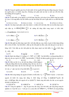 ợ cùng pha, cách nhau 4,5cm. Bư c ơ sóng lan truyền là 1,2cm. O là trung đi m ể c a ủ AB. Đi m ể c c ự đ i ạ trên đo n ạ OB cách O g n ầ nh t ấ và xa nh t ấ l n ầ lư t ợ là A. 0,5cm và 1,5cm. B. 0,6cm và 1,8cm. C. 1cm và 2cm. D. 0,45cm và 1,65cm. Câu 32: Cho đo n ạ m c ạ h g m ồ cu n ộ c m ả thu n ầ L và đi n ệ trở R n i ố ti p. ế Đặt vào hai đ u ầ đo n ạ mạch m t ộ đi n ệ áp u 1 00cos 100 t V thì cư ng ờ độ dòng đi n ệ trong m c ạ h có bi u ể th c ứ 4 i 2cos(100 t )A. Giá trị c a ủ R và L là 1 1 A. R 5 0 ; L H B. R 5 0 2 ; L H 2 2 C. 3 R 5 0 ; L H D. R 5 0 2 ; L H Câu 33: Đặt gi a ữ hai đ u ầ đo n ạ m c ạ h RLC n i ố ti p ế đi n ệ áp xoay chi u ề có giá trị hi u ệ d ng ụ không đ i ổ và t n ầ số 50Hz. T i ạ th i ờ đi m ể t, đi n ệ áp t c ứ th i ờ gi a ữ hai đ u ầ cu n ộ c m ả đ t ạ giá tr ịc c ự đ i ạ và 1 bằng 120V. Tính đi n ệ áp t c ứ th i ờ gi a ữ hai đ u ầ đo n ạ m c ạ h t i ạ th i ờ đi m ể t s. Bi t ế r ng ằ 300 Z 2 Z 2 R. L C A. 67V. B. 60 2V C. 82V. D. 60V.