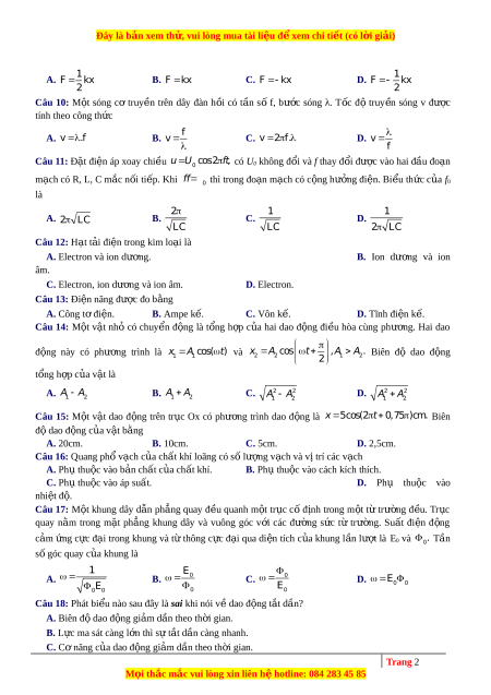Đây là bản xem th , vu ử i lòng mua tài li u ệ đ xe ể m chi ti t ế (có l i ờ gi i ả ) 1 1 A. F kx B. F kx C. F kx D. F kx 2 2 Câu 10: M t ộ sóng cơ truy n ề trên dây đàn h i ồ có t n ầ s ố f, bư c ơ sóng λ. T c ố đ ộ truy n ề sóng v đư c ợ tính theo công th c ứ f A. v .f B. v C. v 2 f . D. v f Câu 11: Đặt đi n ệ áp xoay chi u