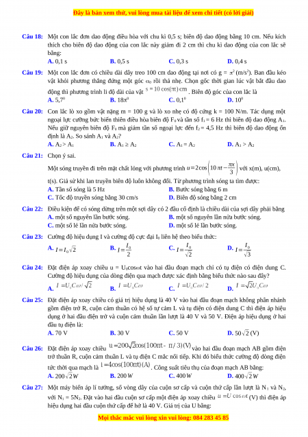 Câu 18: Một con lắc đơn dao động điều hòa với chu kì 0,5 s; biên độ dao động bằng 10 cm. Nếu kích