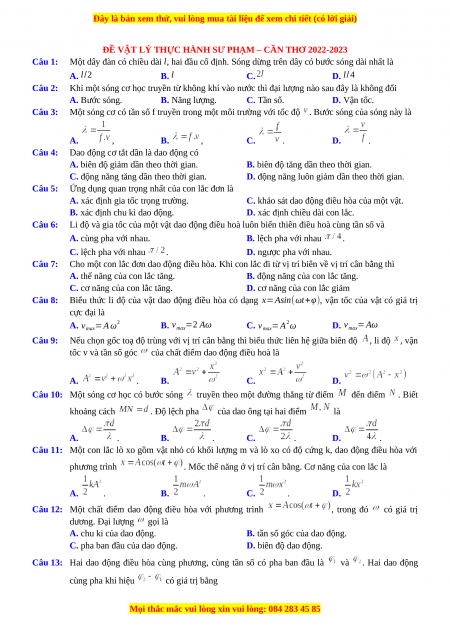 ĐỀ VẬT LÝ THỰC HÀNH SƯ PHẠM – CẦN THƠ 2022-2023 Câu 1: