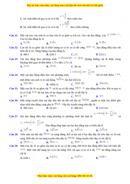 Câu 21: Một vật treo vào một lò xo làm cho lò xo giãn ra 0,8 cm. Cho vật dao động. Lấy .