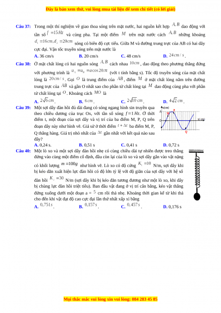 Câu 38: Ở mặt chất lỏng có hai nguồn sóng cách nhau , dao động theo phương thẳng đứng