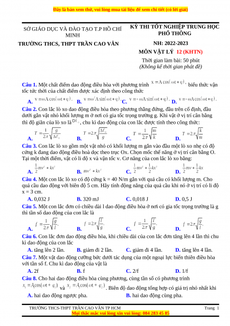 Câu 1. Một chất điểm dao động điều hòa với phương trình biểu thức vận