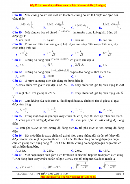 Câu 18. Mức cường độ âm của một âm thanh có cường độ âm là I được xác định bởi công thức A. . B. . C. . D. .