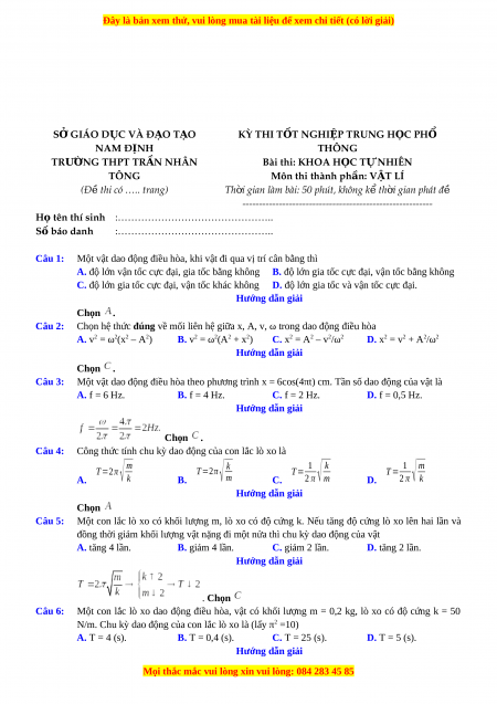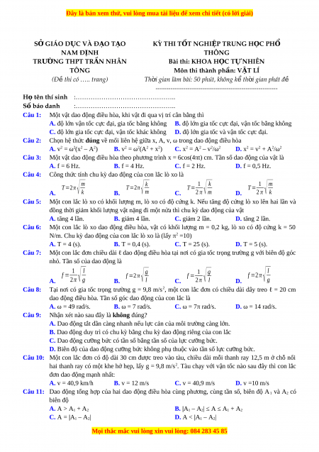 TRƯỜNG THPT TR N NHÂ Ầ N Bài thi: KHOA H C Ọ T NH Ự IÊN TÔNG Môn thi thành ph n ầ : V T L Ậ Í