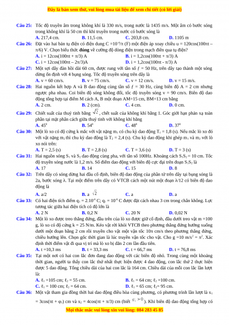 Câu 25: Tốc độ truyền âm trong không khí là 330 m/s, trong nước là 1435 m/s. Một âm có bước sóng