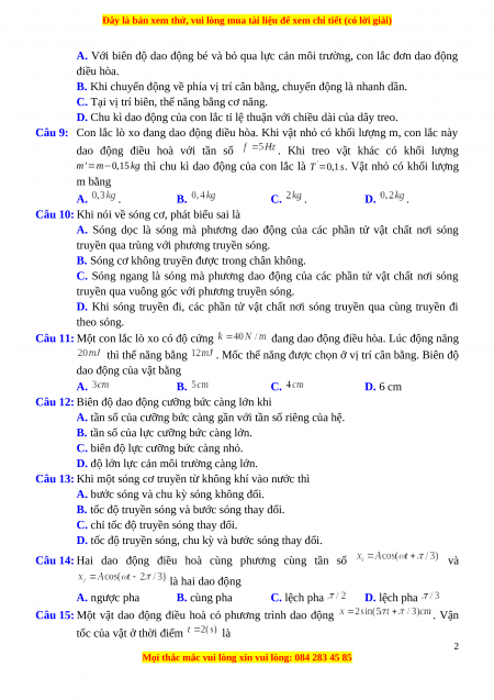 Câu 14: Hai dao động điều hoà cùng phương cùng tần số và là hai dao động A. ngược pha B. cùng pha C. lệch pha D. lệch pha