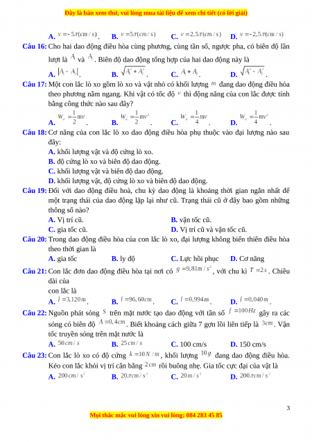 Câu 16: Cho hai dao động điều hòa cùng phương, cùng tần số, ngược pha, có biên độ lần