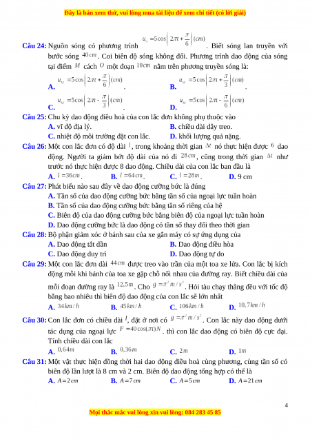 Câu 24: Nguồn sóng có phương trình . Biết sóng lan truyền với