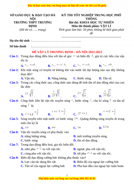ĐỀ VẬT LÝ TRƯƠNG ĐỊNH – HÀ NỘI 2022-2023