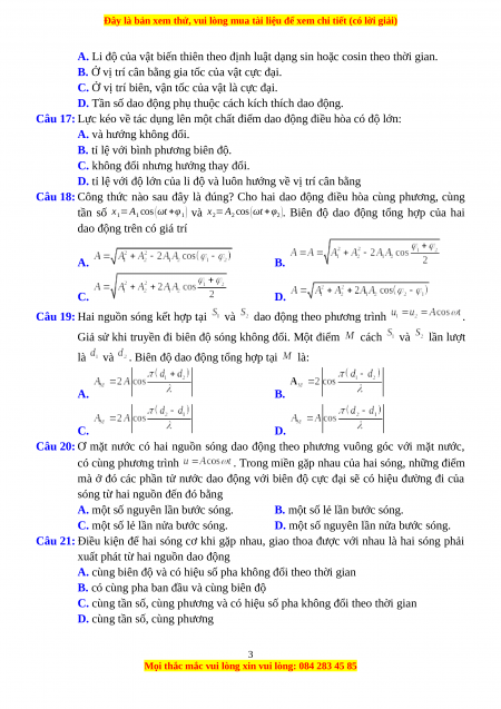 Câu 1: Trong dao động điều hòa với tần số góc và biên độ , giá trị cực tiểu của vận tốc là A. . B. . C. . D. .
