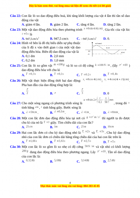Câu 22: Con lắc lò xo dao động điều hoà, khi tăng khối lượng của vật 4 lần thì tần số dao động của vật A. giảm 4 lần. B. giảm 2 lần. C. tăng 4 lần. D. tăng 2 lần.
