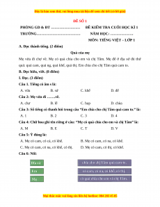 Câu 4: Chữ hoa ghi tên riêng ở câu: “Mẹ có quà chia cho em và chị Tâm” là: A. M B. E C. T D. V Câu 5: Ý đúng là: