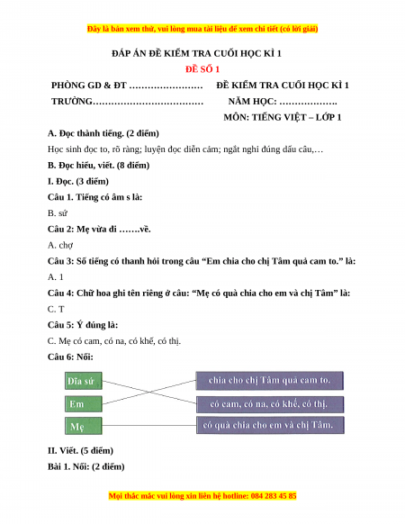 ĐÁP ÁN ĐỀ KIỂM TRA CUỐI HỌC KÌ 1 ĐỀ SỐ 1