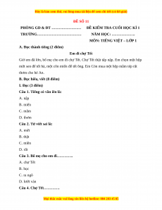 Đề thi Tiếng Việt lớp 1 Học kì 1 Cánh diều (Đề 11)