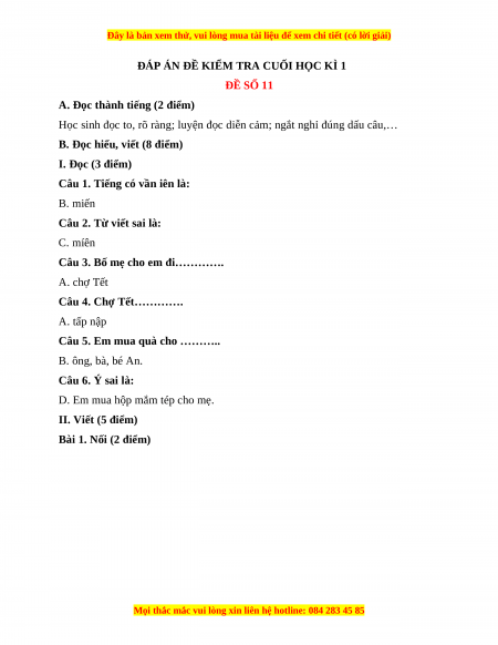 ĐÁP ÁN ĐỀ KIỂM TRA CUỐI HỌC KÌ 1 ĐỀ SỐ 11