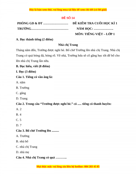A. Đọc thành tiếng (2 điểm) Nhà chị Trang