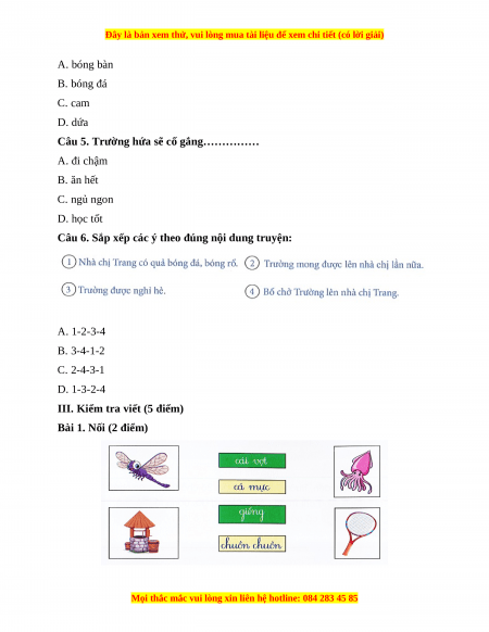 Câu 5. Trường hứa sẽ cố gắng…………… A. đi chậm B. ăn hết C. ngủ ngon D. học tốt