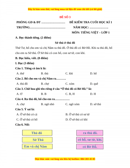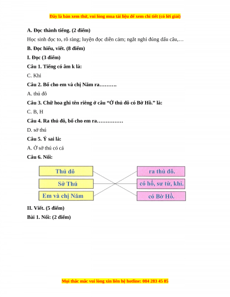 Câu 4. Ra thủ đô, bố cho em ra…………… A. chợ B. ngõ nhỏ C. ngõ xóm D. sở thú Câu 5. Ý sai là: A. Ở sở thú có cá B. Ở sở thú có sư tử C. Ở sở thú có hổ D. Ở sở thú có khỉ Câu 6. Nối: