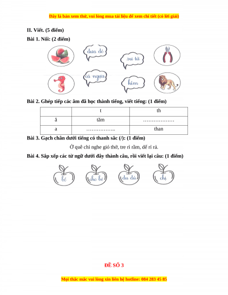 Bài 4. Sắp xếp các từ ngữ dưới đây thành câu, rồi viết lại câu: (1 điểm) ĐỀ SỐ 3